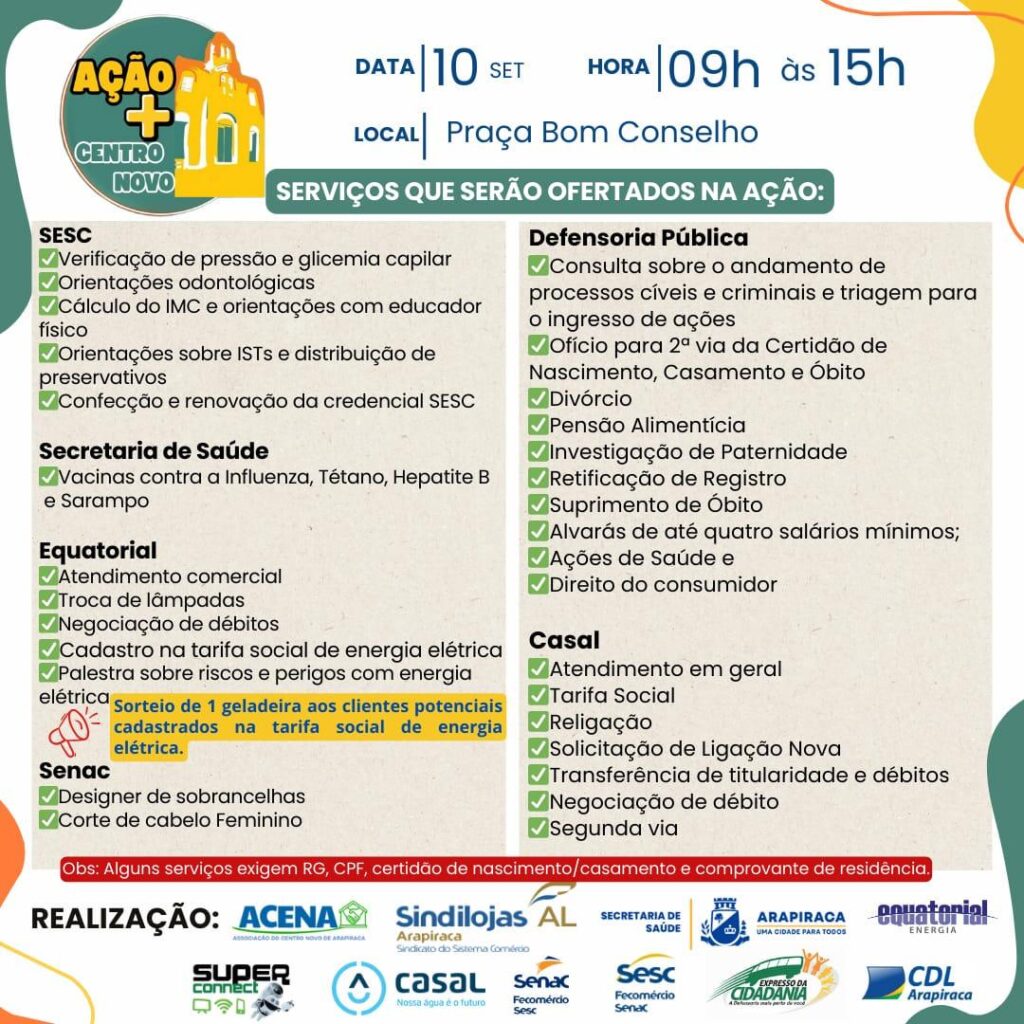🤝 Realização: Sindilojas Arapiraca, Associação do Centro Novo (Acena), Sesc, Senac, Secretaria Municipal de Saúde, Equatorial, Defensoria Pública e Casal